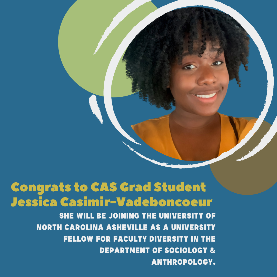 Jessica Casimir-Vadeboncoeur (Sociology) will be joining the University of North Carolina Asheville as a University Fellow for Faculty Diversity in the Department of Sociology & Anthropology.